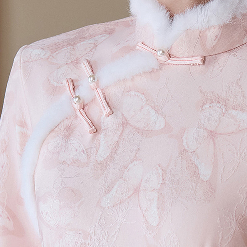 One-sentence summary: A modern winter cheongsam that brings together warmth, elegance, and timeless butterfly-inspired details.