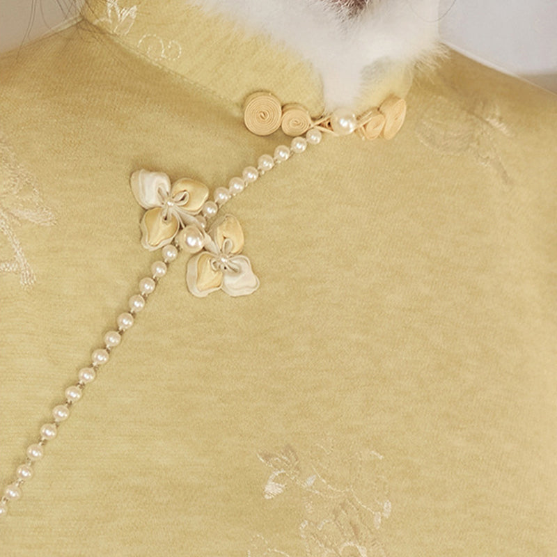 Women's Qipao Xiangling 香玲 is a warm and elegant winter cheongsam inspired by modern Hanfu fashion, featuring soft plush collar details, traditional fastening buttons, and subtle botanical embroidery that adds a refined cultural touch. Designed for autumn and winter, it blends traditional Chinese aesthetics with contemporary comfort for daily wear, festive occasions, cultural events, and photography.