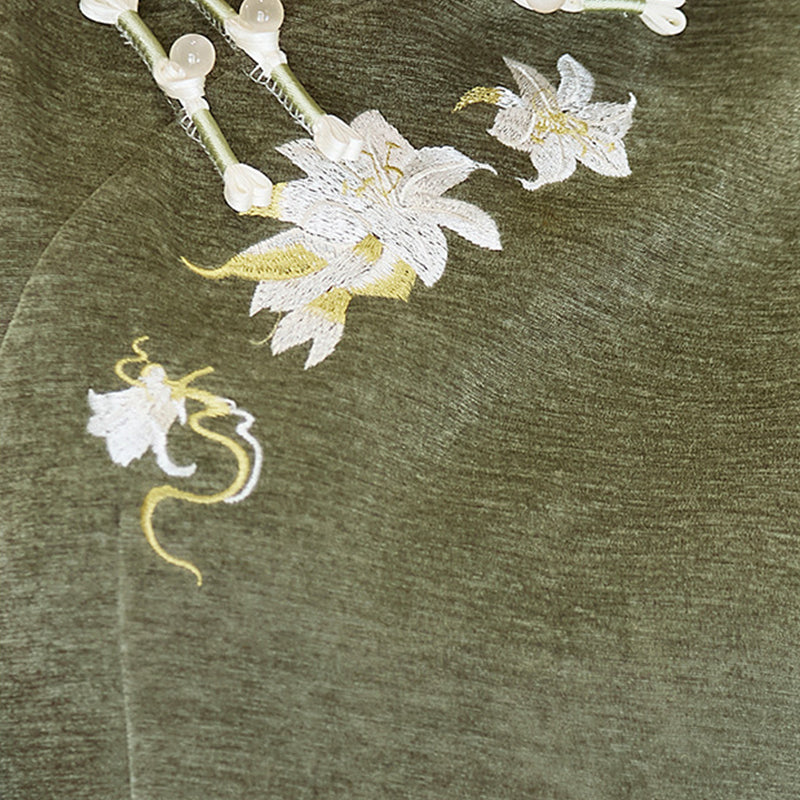 Women's Qipao Songxiang "松香" is a winter-thickened velvet cheongsam inspired by Modern Hanfu design, featuring a standing collar, side opening with traditional frog buttons, and faux-fur cuffs. The dark base fabric is decorated with embroidered butterflies and floral motifs around the collar and waist, creating a refined, poetic feel while keeping the body warm in cold weather.