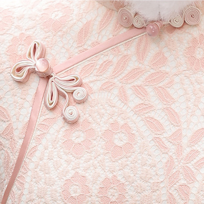 The Furongchang Qipao embodies the soft beauty of lotus petals with its gentle pink jacquard velvet. Featuring fur-trimmed cuffs and collar, this thickened cheongsam keeps you warm while maintaining a refined silhouette. Its subtle floral patterns and classic frog button detail make it ideal for winter gatherings, festive occasions, or elegant photoshoots.