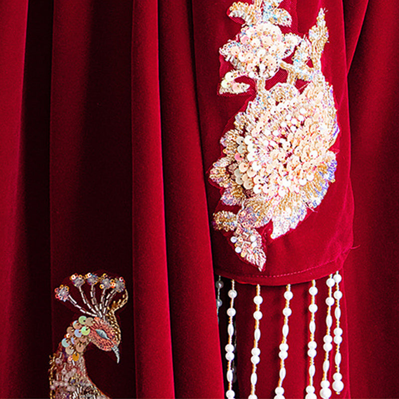 Soft velvet feels warm in autumn and winter seasons, bringing comfort together with regal presence. When she walks, embroidery and tassels move like a phoenix opening her wings—lively, dignified, romantic.