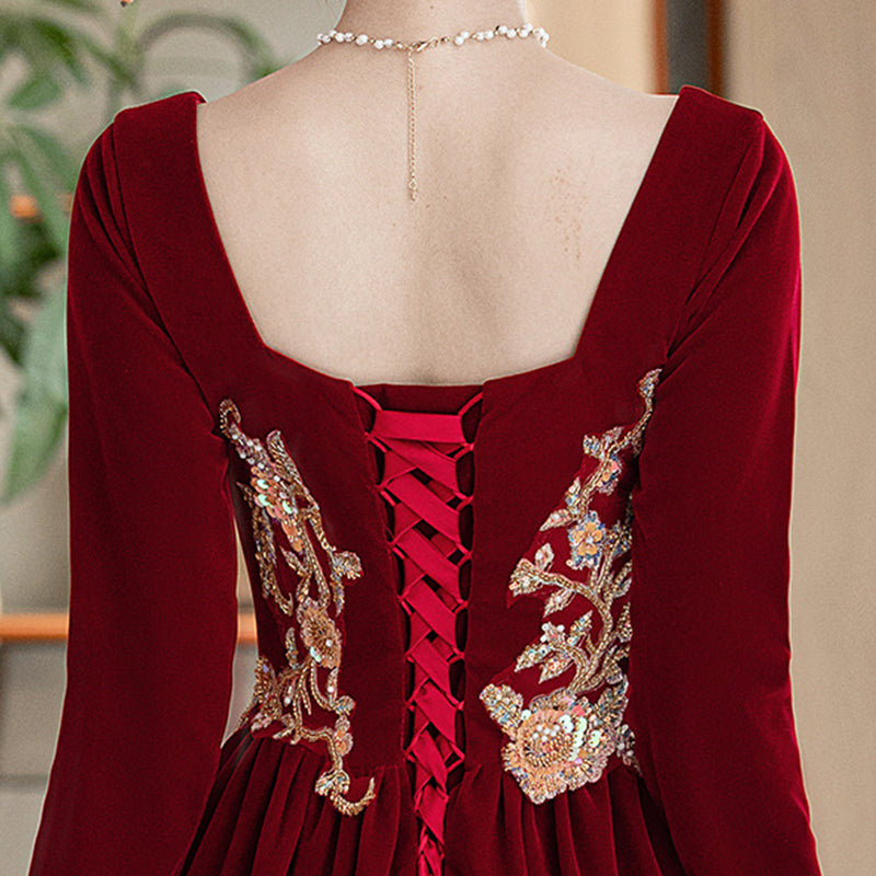 The deep red velvet gown forms a flattering A-line silhouette, embroidered with golden floral motifs that shimmer like firelight and symbolize happiness and eternal love. The structured neckline blends modern gown design with traditional ornamentation, making it perfect for tea ceremonies, wedding banquets, engagement dinners, and reception looks.