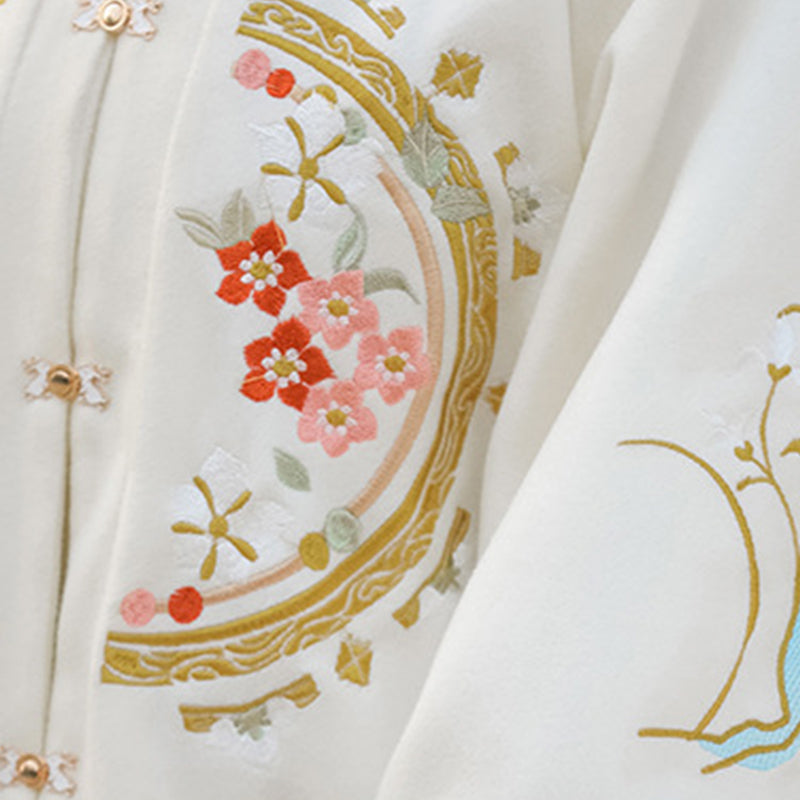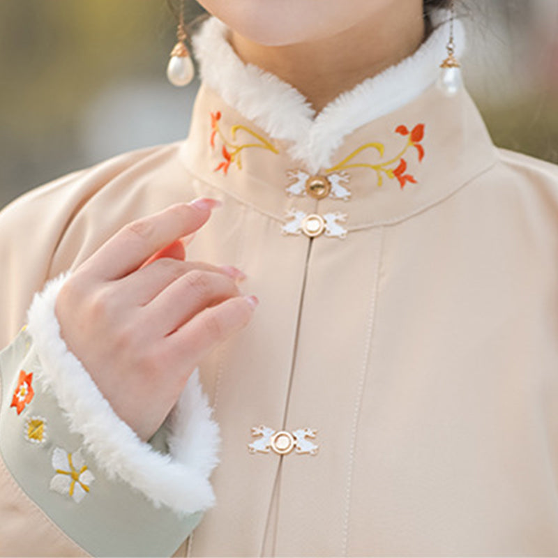 The jacket is available in red or ivory, both adorned with intricate embroidered floral motifs and soft faux-fur trims for warmth and refined grace. The skirt carries traditional Ming-style decorative patterns, flowing with ceremonial dignity and festive charm.