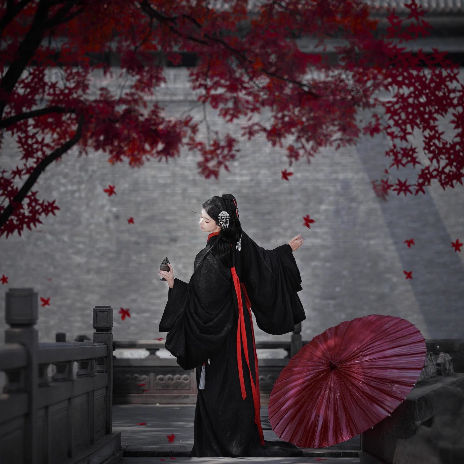 Ancient beauty meets Qin Dynasty majesty in this refined black-and-red ensemble.
