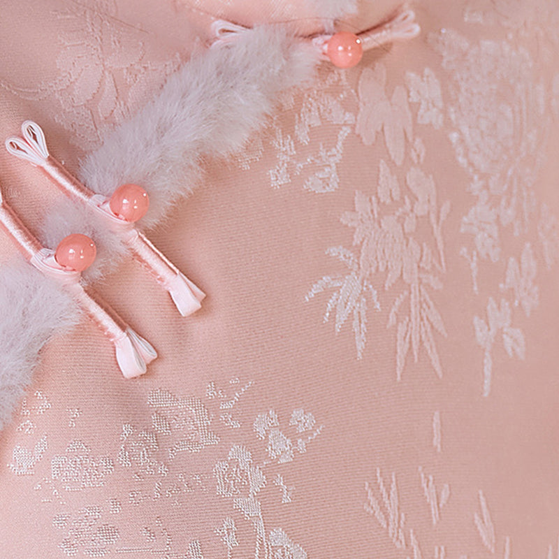 The Women’s Qipao Diefeiwu 蝶飞舞 is a warm autumn-winter cheongsam designed for modern Asian fashion lovers. Featuring a plush stand collar, velvet-trimmed crossover front, and traditional knot buttons along the neckline, waist, and side, this dress blends cultural elegance with seasonal comfort. The surface fabric is delicately embroidered with tone-on-tone botanical motifs, bringing subtle sophistication without overwhelming the design. With thickened fleece-lined construction, it offers both softness and structured silhouette, suitable for winter outings, festivals, or modern hanfu styling.