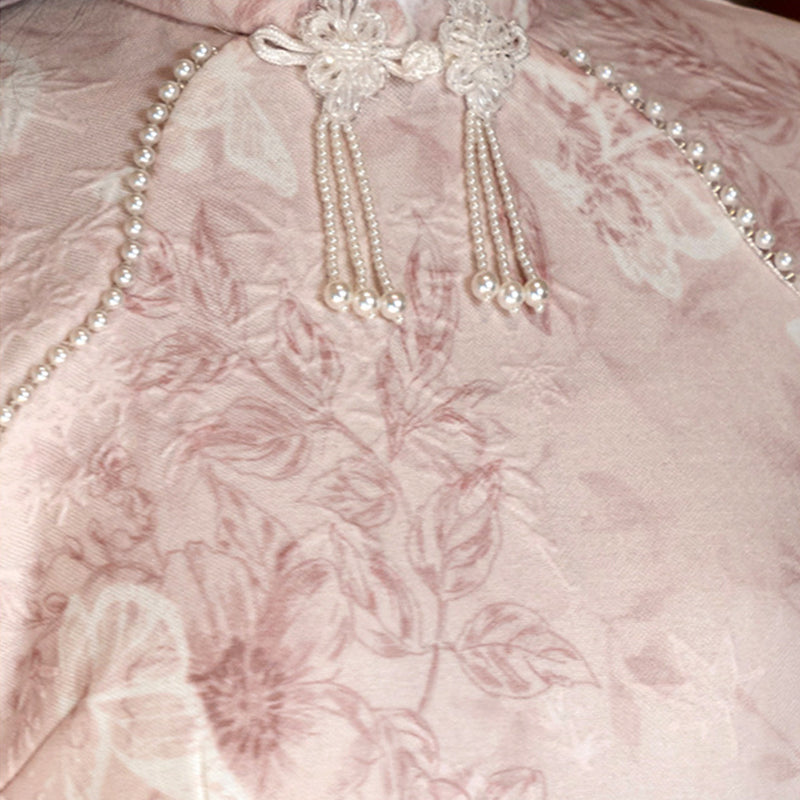 This thickened velvet cheongsam features a white-fur mandarin collar, matching fur-trimmed cuffs, and a symmetrical front decorated with delicate pearl buttons. The pink fabric is enriched with layered tones of blush and white, forming gentle botanical motifs and butterfly outlines—subtle, graceful, and poetic in motion.