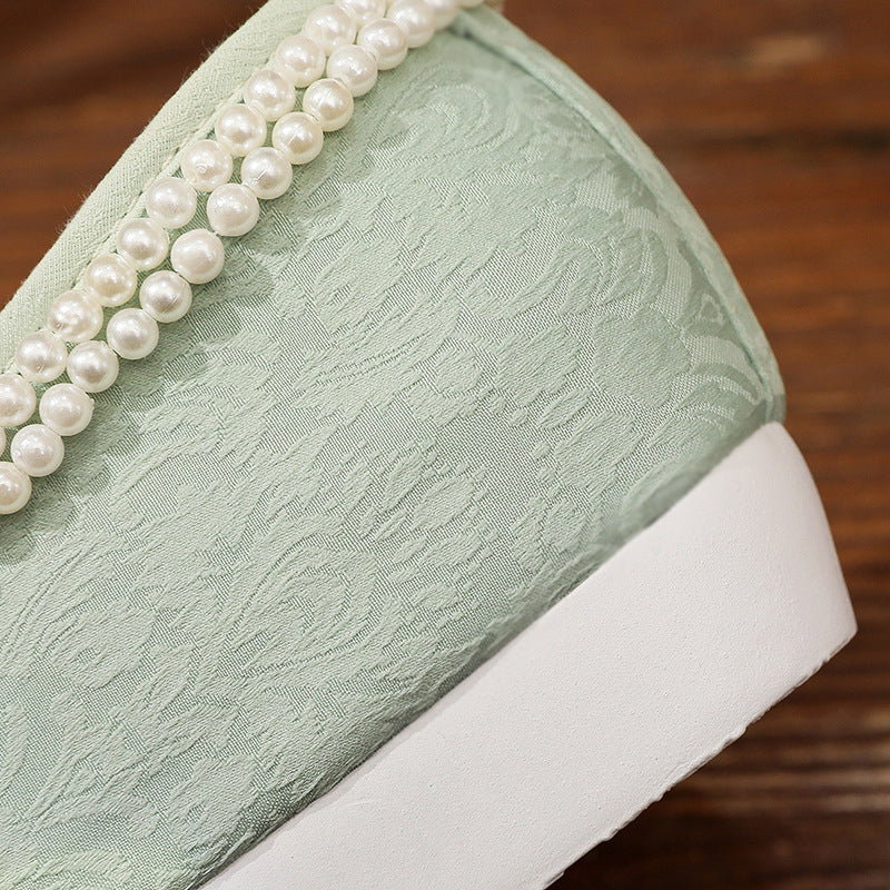 The Dengyun shoes combine traditional Chinese jacquard fabric with elegant pearl decoration around the edge, offering a blend of ancient charm and modern comfort. Featuring an inner height increase design, soft rounded toe, and durable anti-slip sole, they are available in green and apricot colors, with fleece-lined and non-fleece options for all seasons. These shoes evoke the serene beauty of classical attire while providing gentle lift and warmth for everyday elegance.